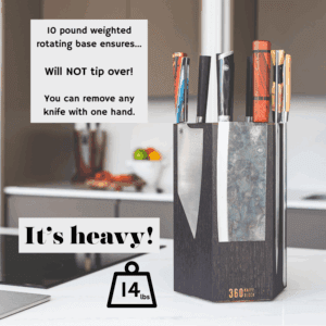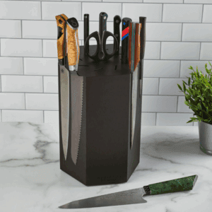 Capacity for 20+ knives – up to three pear-ing knives on any of the 6x 4″ sides + an array of 8 top slots for up to 5.5″ blades and a center hex for kitchen sheers. The ultimate in knife display, ideal for kitchen islands or anywhere with the ability to pull out knives from the top slots. The 360KnifeBlock MAX is 12″ tall for capacity for up to 12″ long blades.