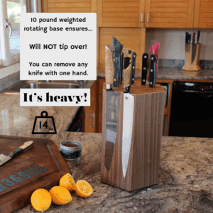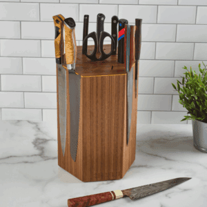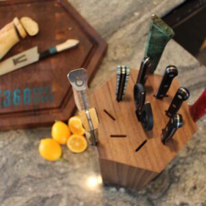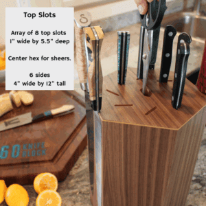 Capacity for 20+ knives – up to three pear-ing knives on any of the 6x 4″ sides. the MAX features an array of 8 top slots for up to 5.5″ long blades and a center hex hole for your kitchen sheers. The ultimate in knife display, ideal for kitchen islands or anywhere with the ability to pull out knives from the top slots. The 360KnifeBlock MAX is 12″ tall for capacity for up to 12″ long blades.