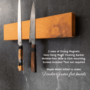 The 360KnifeBlock™ BAR is no ordinary knife strip. Every style BAR features TWO (2) rows of strong Neodymium magnets for a secure hold – both vertical or horizontal mounting is possibly thanks to the double deep magnetic lay out. This ensures ALL knives are safely secure in any position. Our BAR is made with heat treated maple milled to make Fender Guitar necks from our local Tacoma Washington wood supplier. Using this special guitar wood off-cuts we craft limited batches of wall mounted magnetic 360KnifeBlock™ BAR.