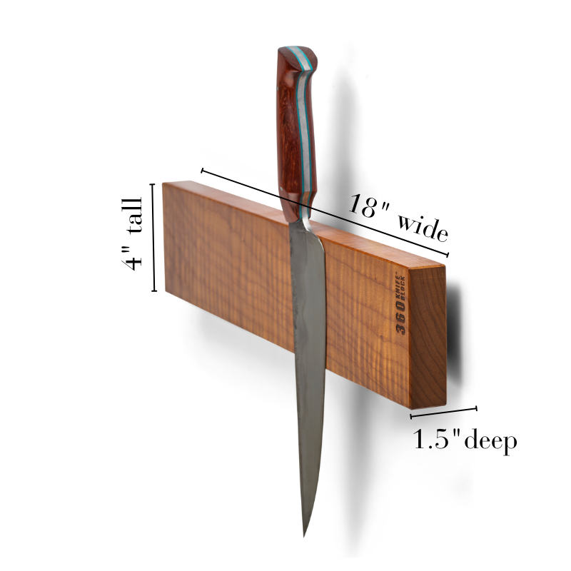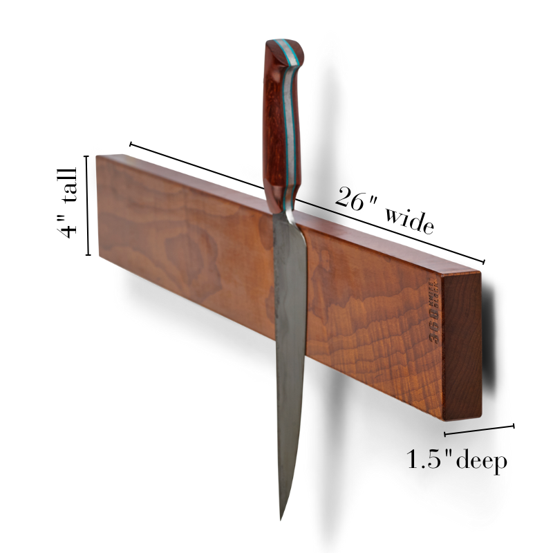 At 4″ tall and 5″ wide HEX or 18″ BAR or 26″ BARXL – our magnetic wood knife bars are larger than anything else on the market. All bars are 1.5″ deep to give space for knife handles, hands and back splashes.